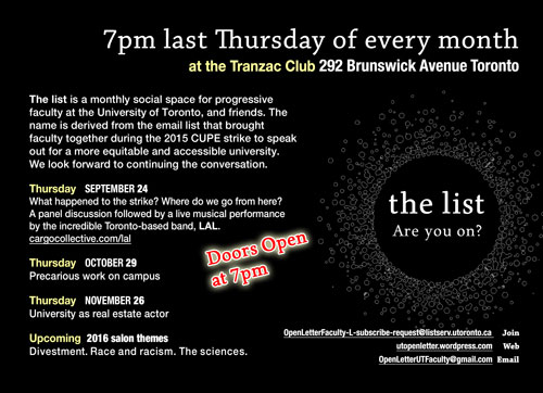 The list is a monthly social space for progressive faculty at the University of Toronto, and friends. The name is derived from the email list that brought faculty together during the 2015 CUPE strike to speak out for a more equitable and accessible university. We look forward to continuing the conversation.