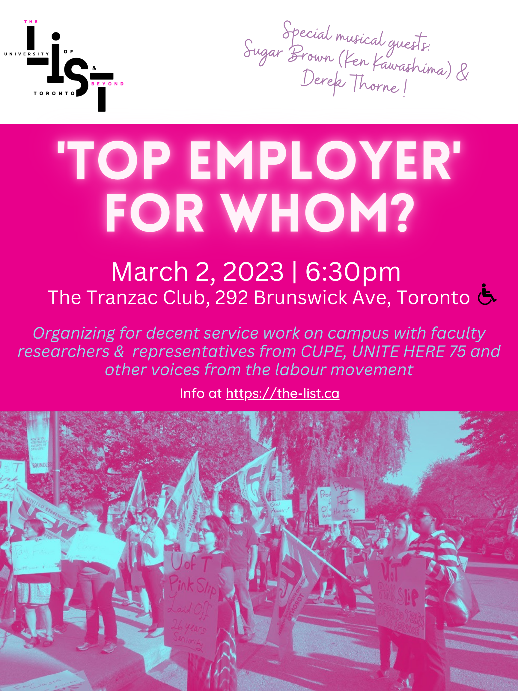 Join us on Thursday, March 2 at the Tranzac Club for an evening of music, friendship and solidarity as we learn about the stakes and struggle over organizing for decent work on campus. We’ll listen to some amazing music from Sugar Brown & Derek Thorne, and then we will hear from reps from the campus labour movement and faculty researchers working with them.